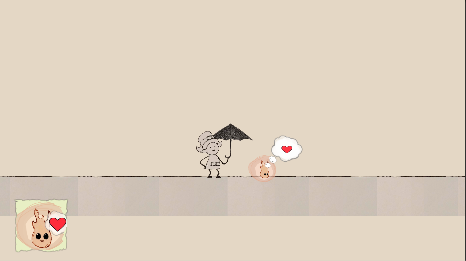 The flame spirit has more to show than just its health. The player needs to know what the AI is doing or wants so they can properly interact with them. In the story the flame can't speak, so we can't just have a dialogue appear. We needed something else to show the player what to do. What I came up with was to have thought bubbles appear from the flame that shows what they want/need/feel. Each thought bubble has a key event that makes it happen. Some thought bubbles go together, such as the flame might show that they want kindling and when they eat the kindling they show that they love the player with the heart thought.